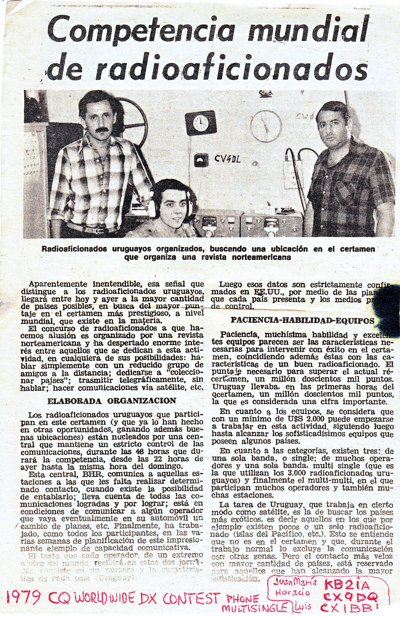 1979. CWØA, Phone, Multisingle. De izq. a der.: Juan María Banegas, KB2IA; Horacio Nigro, CX9DQ; Luis H. Murdocco, CX1BBL. Quienes me rodean en la foto, han sido notables operadores y DXistas, alguno de ellos en su momento, campeones mundiales de telegrafía. Fue tomada en el mítico " shack" de CX1BBL. El texto redactado en el último párrafo por el periodista tiene algunos "inventos o confusiones" gruesos, sin embargo. La explicación fue originalmente buena... pero el pobre comprendió la mitad de como es la mecánica de un concurso mundial de esta naturaleza.