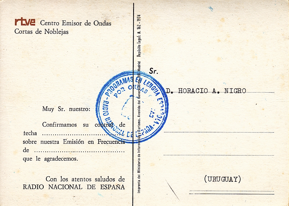 Centro Emisor de Noblejas (tarjeta QSL, colección Horacio Nigro 1974)