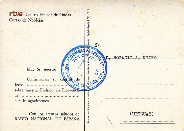 Menciono otros programas preferidos de mi sintonía: «Directo, Directo», con llamadas telefónicas de la audiencia sobre temas variados, escuchado algún febrero en las vacaciones de verano de los 80s. «Vanguardia de la Ciencia»,  lamentablemente ya desaparecido, y algunos otros que siempre estaban presentes en el momento de sintonizarla: «Mundo Solidario», con aquellas recordadas entrevistas a las monjitas españolas situadas en misión de solidaridad en algun país de la torturada África. O «Hispanorama» la revista informativa cultural, que incluso se emitía como transcripción en las emisoras locales de Onda Media uruguayas, como el SODRE. Hubo algún uruguayo trabajando allí, también. Y en los últimos tiempos,  «Amigos de la Onda Corta».