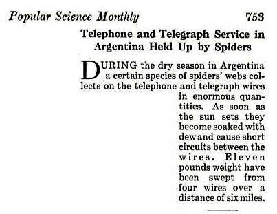 Durante la estación seca en la Argentina una determinada especie de telarañas se acumula en los alambres del telégrafo y el teléfono en cantidades enormes. Tan pronto como se pone el sol, se empapan por el rocío y provocan un cortocircuito entre los cables. Once libras de peso¹ han sido retiradas con barrido de cuatro cables a una distancia de seis millas.»