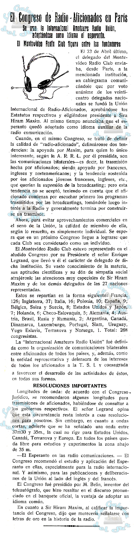 Y Legrand, como Presidente del Montevideo Radio Club, segunda asociación de radioaficionados de la historia creada en Uruguay, estuvo en París. Así enviaba un informe de lo que en ella se había resuelto: