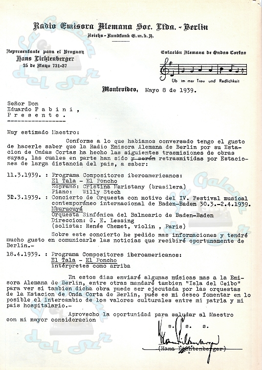 La siguiente es una carta dirigida a Fabini, sobre el programa irradiado por la Radiodifusora Alemana de Ondas Cortas en 1939, y firmada por su representante en Uruguay.