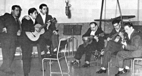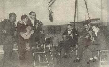 El fogón de los arrieros, en 1940, fue el primer programa radial de música folclórica de gran alcance nacional, en Argentina, pergeñado y dirigido por Buenaventura Luna (extremo izquierdo). (Fuente Diario de Cuyo)