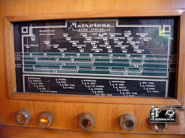 De confección uruguaya, y de marca «Metrotone», el dial de este aparato valvular, fue fabricado con la técnica de estampado en serigrafía sobre vidrio.