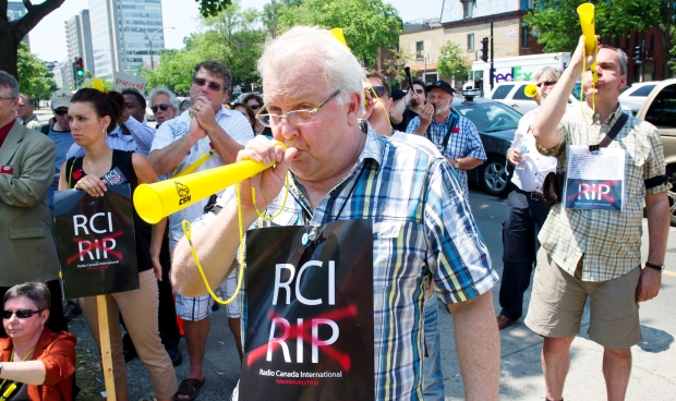 Empleados y simpatizantes de la CBC manifiestan su descontento por los recortes presupuestales que han cercenado a Radio Canada International, Miércoles 20 de junio de 2012 en Montreal. (Foto: Paul Chiasson , The Canadian Press)