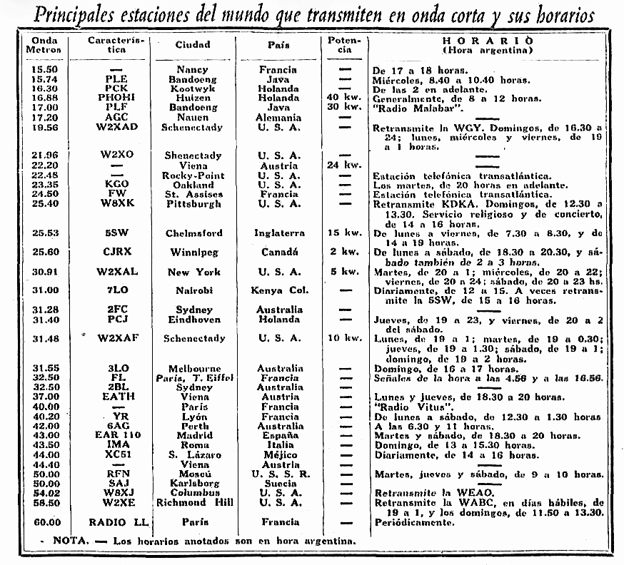 Con este título, en la Sección «Radiotelefonía» de la revista semanal «Caras y Caretas», de Buenos Aires, Argentina y dirigida por muchos años en la década de los 20 y 30, por el aficionado y divulgador Don Raúl Bordenave, publicó el 17 de agosto de 1929 una lista de las «Principales estaciones del mundo que transmiten en ondas cortas.»