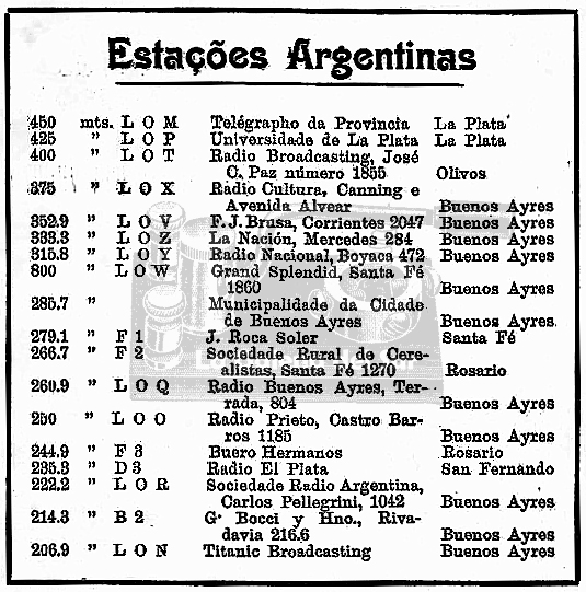 Lista de Estaciones argentinas, publicada en «Electron», Rio de Janeiro, Brasil, Nº 15, setiembre de 1926.