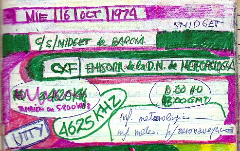 A fines de la década de 1970, cuando inicié mis actividades de escucha radial, una de las captaciones más interesantes era la de su estación trasmisora de Onda Corta en la banda de 60 metros, con indicativo CXF, «emisora de la Dirección Nacional de Meteorología», en la frecuencia de 4625 kHz; también en 5.800 kHz. En mi log figura entrada con fecha 16 de octubre de 1974, a la hora 10:00 de Uruguay, 13:00 GMT, con el informativo meteorológico para la aeronavegación.