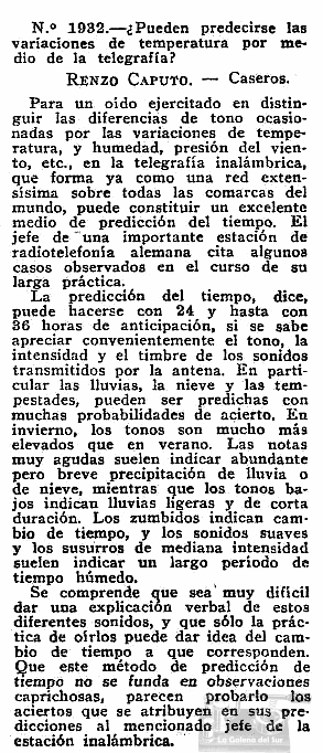 En el «Consultorio» de la revista argentina «Caras y Caretas» de 1922, un lector hace la interesante pregunta sobre la predicción de temperaturas por medio de la (radio) telegrafía.