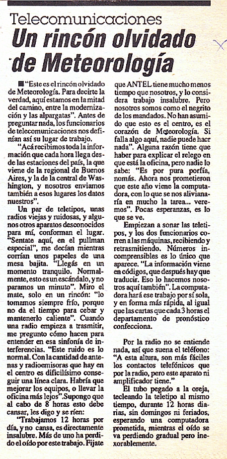 Un recorte de diario montevideano de los años 80, nos acerca referencias testimoniales de la sección radio de «Meteorología».