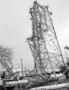 Así quedó la antena de FM del Sol, 99.5, Montevideo, después temporal del 23 de agosto de 2005. Barrio «Cerrito de la Victoria». (Foto «LR21). Finalmente fue demolida totalmente.