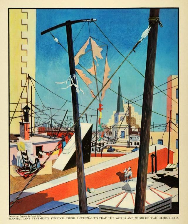 Reproducción de una ilustración publicada en la revista norteamericana «Fortune» de 1938, mostrando las antenas en las azoteas del barrio neoyorquino de Manhattan. Se aprecian las cuerdas con ropa tendida y entre los alambres una cometa destruída. El notable dibujo es de Francis Criss.