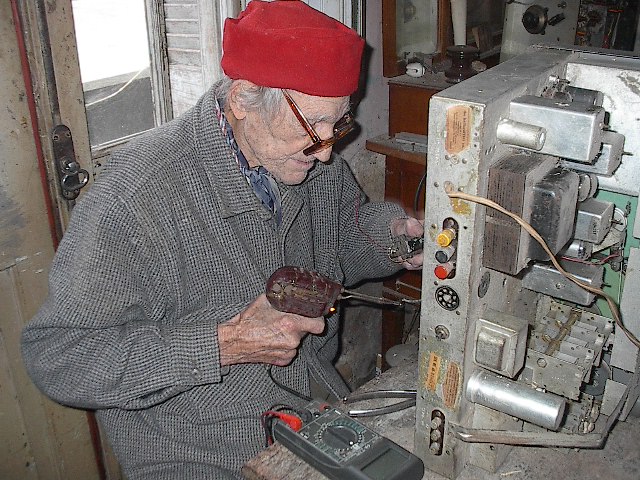 Luis Alberto, a los 94 años, reparando el transmisor que le hizo a su hija, Sandra, CX3VU. 1 x 6146 x 2 EL34. Hizo un transmisor para cada uno de los cuatro hijos: Fernando está en Melo y Luis es cura párroco en Treinta y Tres. Pero la única con licencia oriental fue Sandra. (Foto: gentileza de su hijo, Roberto Silva, LW2ESG).