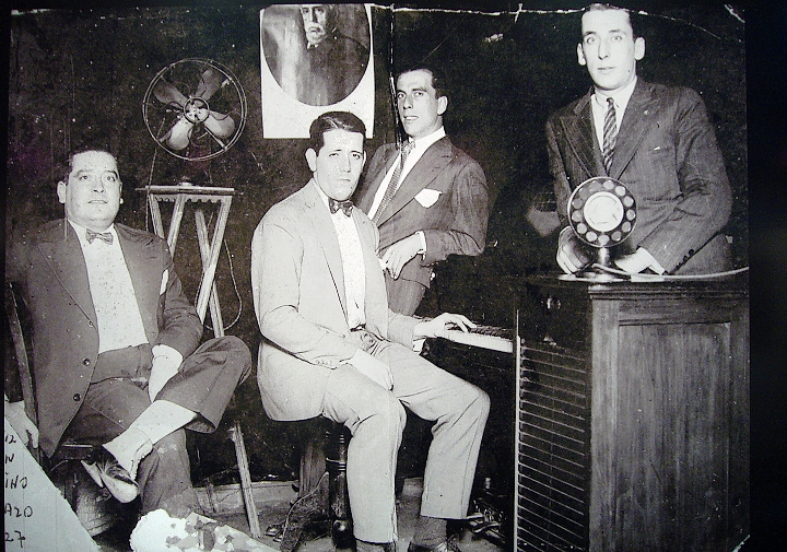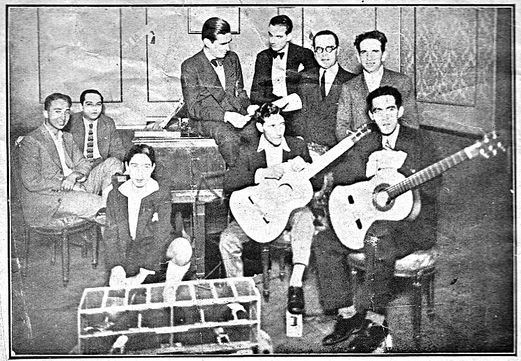 Integrantes de «La Jaula Dorada» y «La Hora Meridiana», en 1932, que dirigía «Don Severo» con señalado éxito, en C X 14 – «El Espectador». En el piano, Teddy y Pirulo Barthe; sobre el piano «El Mirlo», que cantaba todos los días de 12 y 30 a 13 y 30 y «El Zorzal»; junto a éste, «Don X» y el secretario de Don Severo. En el primer plano aparecen el «Pibe Raúl» (seudónimo de Raúl Barbero), Guerrero y el concertista Suárez. (POEUR, archivo Horacio Nigro, LGdS)