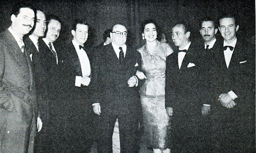 Orquesta de Francisco Canaro en Carve. De izquierda a derecha el primero es Eduardo Adrián, el tercero Carlos Roldán, el cuarto Mariano Mores, el quinto Francisco Canaro. Abajo, de izquierda a derecha, el segundo es Minotto Di Cicco y el tercero Ernesto De Franco. Año 1942 (aprox.). (Foto: Colección Carlos Aguiar, en Fotos de Montevideo Antiguo, Facebook)