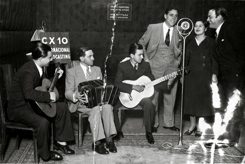 La Orquesta de Edgardo Donato, que actuó en Radio Paradizábal, la primera emisora comercial uruguaya. El primer locutor, Luis Viapiana, cantaba en la emisora además, sus canzonettas y presentó a esta «Gran Orquesta», que los lunes de tarde, interpretaba tangos, fox-trots y shimmies. Edgardo Donato (1897-1963), nació en Buenos Aires y se radicó en Montevideo con su familia desde 1899. Es una de las orquestas más famosas de la historia del tango. Como compositor se destacan entre sus obras “A media luz” compuesta junto con el uruguayo C.Lenzi y “El huracán”. (Foto: Museo y Centro de Documentación AGADU).