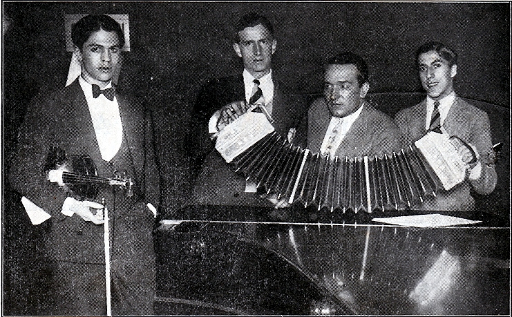 Orquesta típica de CX 30 Radio Nacional. Integrantes: Luis Álvarez (violín); José G. Cabral (piano); Eduardo de la Puente, (bandoneón) y Domingo G. Zanabria. (Foto archivo Horacio Nigro, LGdS)