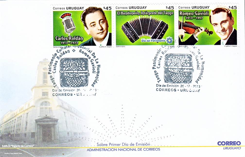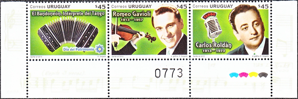 Serie filatélica emitida en en adhesión del Tango, tema del Día del Patrimonio 2013. El sello que ilustra a Carlos Roldán, tiene un micrófono usado en radiodifusión. (Colección Horacio Nigro, LGdS)