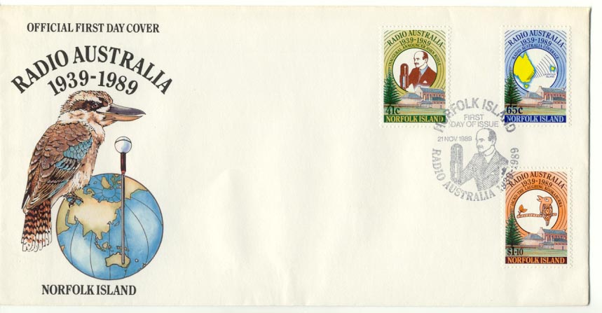 Radio Australia, abre sus emisiones con la melodía «Waltzing Matilda» y el canto del pájaro llamado «Kookaburra». Sus programas son destinados al Pacífico y Oceanía, pero han sido muy populares en todo el mundo anglófono. Sobre Primer Día y sellos de la Isla Norfolk, conmemorando el cincuentenario de Radio Australia.