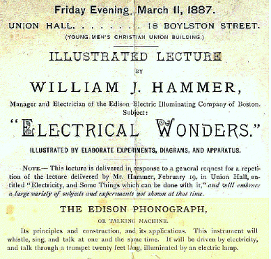Anuncio de 1887 de William J. Conferencia de Hammer sobre “Electrical Wonders» (Maravillas. Eléctricas»). (Fuente; Electrical Diableries | Allen Koenigsberg http://www.GardenStateLegacy.com. Issue 35 March 2017)