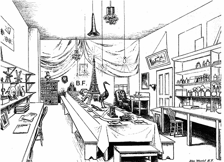 Boceto de Richard F. Outcault de la «Diablerie» eléctrica de 1891 de Hammer, incluyendo el busto «parlante» con la figura de cera de Benjamín Franklin al frente de la mesa. (Fuente; Electrical Diableries | Allen Koenigsberg http://www.GardenStateLegacy.com. Issue 35 March 2017)