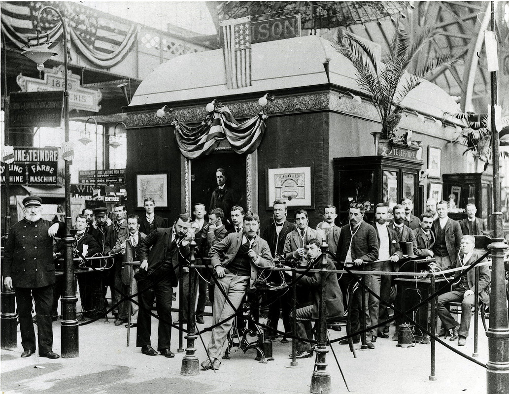 «Todos con auriculares a la escucha del fonógrafo de Edison». William Joseph Hammer en la Exposición de París, Francia, 1889. (Crédito: Edison Phonograph Exhibit).