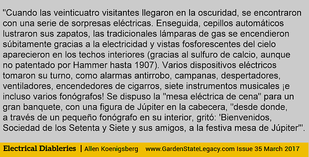 Después de que los invitados disfrutaron de una hermosa exhibición de experimentos eléctricos, dirigidos por el señor Hammer y el profesor George C. Sonn, fueron escoltados al comedor, donde se había preparado una cena eléctrica que estaba presidida por ‘Júpiter’, quien vestía de etiqueta y se sentaba en la cabecera de la mesa, donde mediante un pequeño fonógrafo dentro de su anatomía gritaba: «Bienvenidos, Sociedad de los Setenta y Siete y sus amigos, a la festiva mesa de Júpiter». El menú era el siguiente: «Tostadas eléctricas», «Pastel del mago», «Pudín del infierno», «Pastel magnético», «Pastel del telégrafo», «Pastel del teléfono», «Pastel de corriente eléctrica Ohm-hecho», «Frutas de Menlo Park», «Limonada incandescente», «Café eléctrico» y «Cigarros», etc., y música a cargo de la Orquesta Eléctrica del Prof. Mefistófeles.