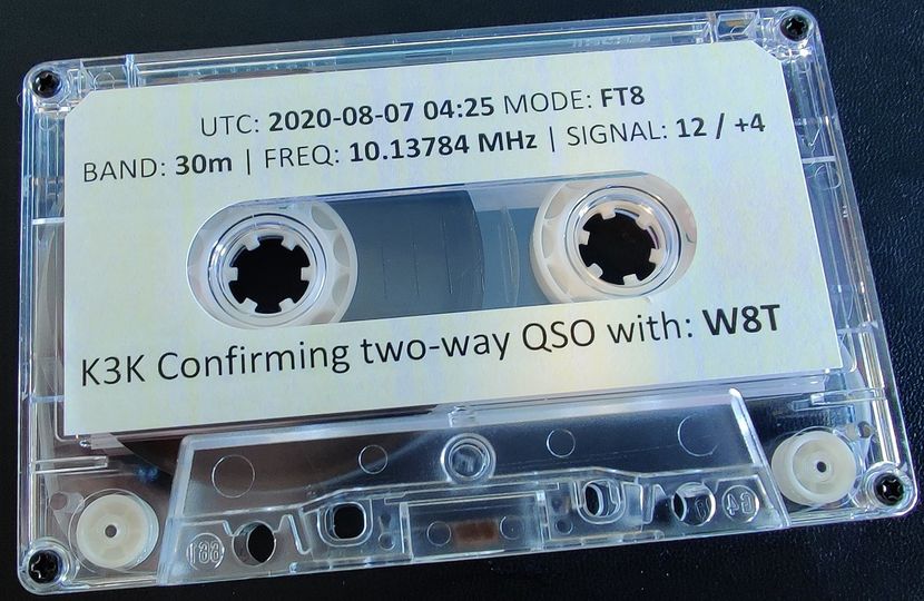 - Casete de audio que como QSL confirma incluyendo los datos y el registro sonoro de un comunicado realizado en modo digital FT8. (Fuente).