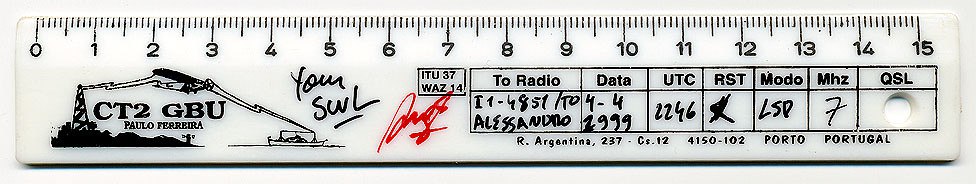 - Paulo Ferreira, CT2GBU, de Porto, Portugal, envió en 1999 una QSL tan inusual como la que se ilustra a continuación realizada en una regla de medir. (Fuente).