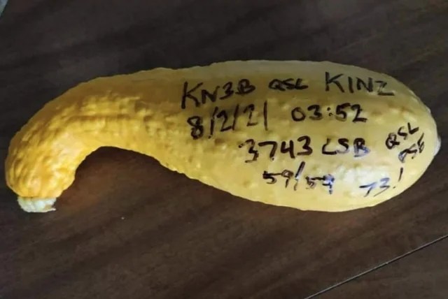 - QSL con las anotaciones escritas en una calabaza del comunicado hecho entre KN3B y K1NZ de Estados Unidos de América. (Fuente).