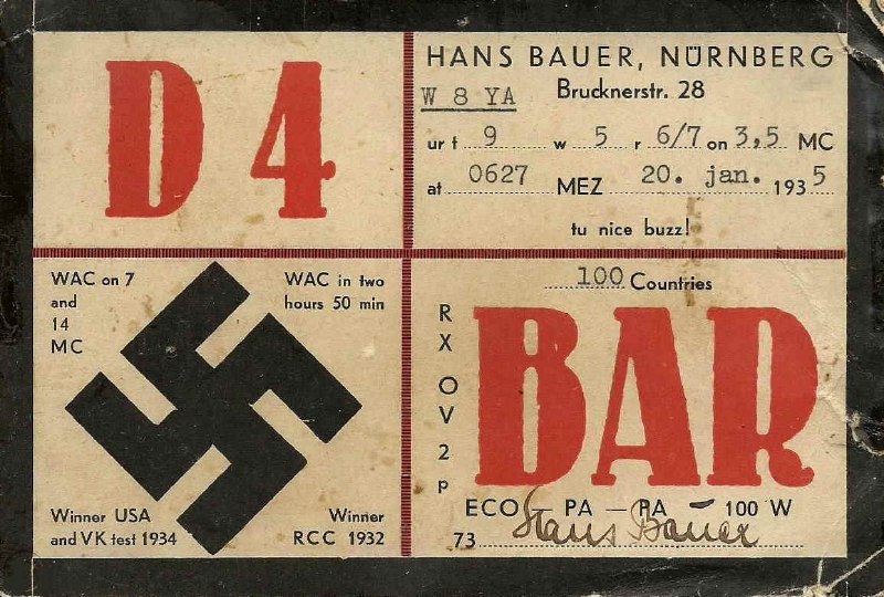 - QSL de Hans Bauer, D4BAR, de Nurnberg (Nuremberg), Alemania, confirmando un QSO con Thomas George, W8YA, de Cincinnati, Ohio en 1935. (Fuente).