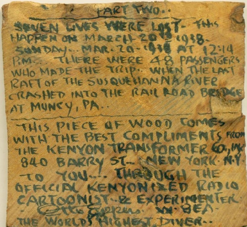 Inusual QSL realizada en una lámina de madera, creada por el famoso dibujante Otto Eppers, W8EA, de Clearfield, Pensilvania, enviada en 1938 a Geo Carr, W8NNY, de Shamokin, Pensilvania. (Fuente).