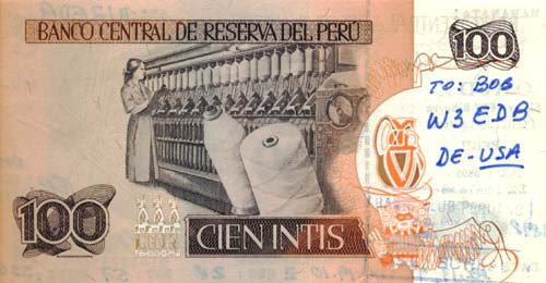 Banknote QSL of Elmer Ribeyro, OA8DX (ex OA7AAS), from Iquitos, Peru, for 1991 QSO with Robert Donovan, W3EDB, from Middletown, Delaware._B