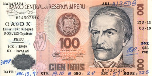 Banknote QSL of Elmer Ribeyro, OA8DX (ex OA7AAS), from Iquitos, Peru, for 1991 QSO with Robert Donovan, W3EDB, from Middletown, Delaware.