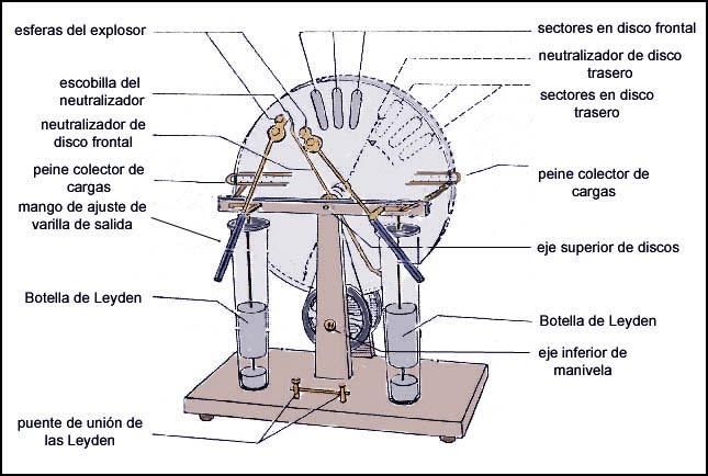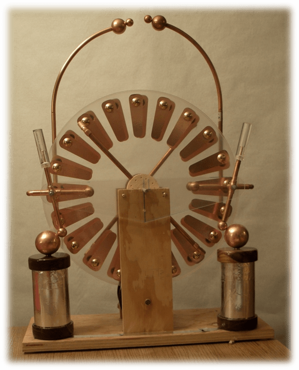 La máquina de Wimshurst es un generador electrostático de alto voltaje desarrollado entre 1880 y 1883 por el inventor británico James Wimshurst (1832-1903). Tiene un aspecto característico con dos grandes discos a contrarrotación (giran en sentidos opuestos) montados en un plano vertical, dos barras cruzadas con cepillos metálicos, y dos esferas de metal separadas por una distancia donde saltan las chispas.