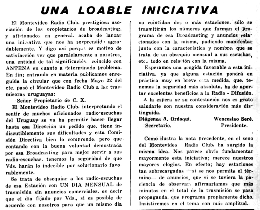 ← «Una loable iniciativa». El Montevideo Radio Club propone un día sin avisos publicitarios. (Antena Uruguaya, 1 de junio de 1933).