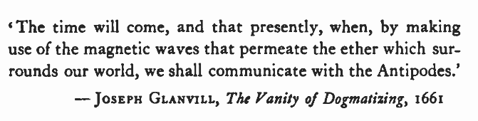 The Vanity of Dogmatizing. (Título completo: The Vanity of Dogmatizing, or Confidence in Opinions Manifested in a Discourse of the Shortness and Uncertainty of our Knowledge). Edición original: Londres, 1661. El libro termina con un epílogo titulado Plus Ultra, donde Glanvill especula sobre descubrimientos futuros. Allí se encuentra el pasaje sobre las “magnetick waves” y la comunicación con los Antípodas.