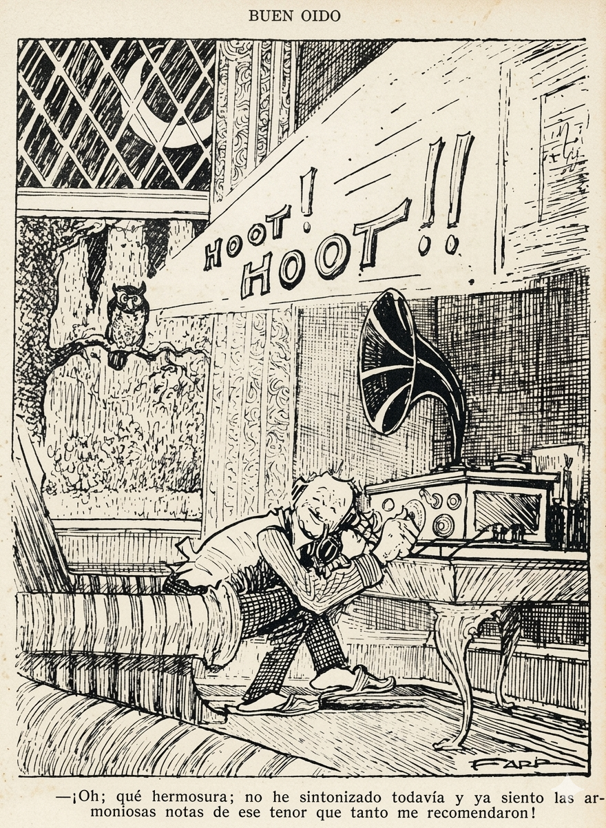 La escena nos presenta a un radioescucha entregado, con los auriculares puestos y la mano en el dial, cerrando los ojos con deleite. Su rostro es de pura satisfacción: cree estar escuchando las armoniosas notas de un famoso tenor. Sin embargo, el remate cómico está tras la ventana: el sonido que lo tiene maravillado no es una señal lejana de una gran ciudad, sino el «Hoot! Hoot!!» de un búho posado en una rama.