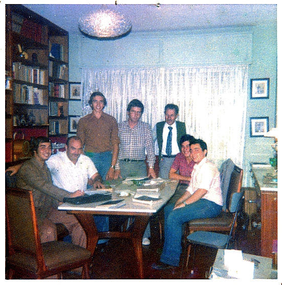 Reunión del DX Club del Uruguay. De izq. a der.: Fernando González, Manuel A. Barcia, José C. Franchi, Miguel A. Faccioli, Jorge E. Laitano, Jorge . Laitano, Horacio Nigro, en el QTH de éste. Circa 1975. (Archivo Horacio Nigro, LGdS)