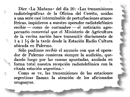 Desaparecían así las interferencias a los entonces un tanto rudimentarios receptores de la época, haciéndose posible la recepción sin molestias de los programas de las estaciones de radiodifusión y de Buenos Aires. Y también, al mismo tiempo se iniciaba la era electrónica de la Telegrafía sin Hilos en nuestro país.