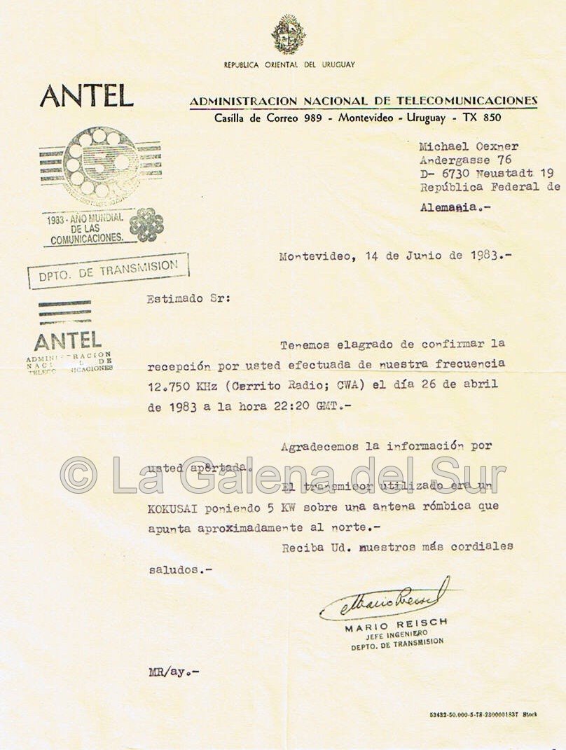 Carta QSL confirmando la recepción de la señal de CWA Cerrito radio en el año 1983, por parte de un DXista, radioaficionado alemán.