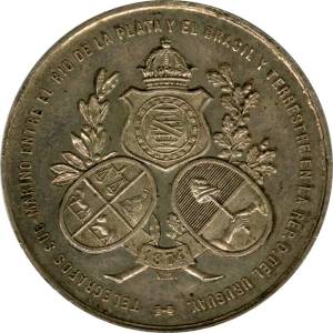 Medalla conmemorativa de la inauguración del cable del Río de la Plata por la «Companhia Telegráfica Platino Brasileira», acuñada en 1874 por Siemens Brothers, London. El coleccionista uruguayo Gustavo Coll anota que la medalla muestra los escudos de Brasil, Argentina y Uruguay en el anverso,mientras que el reverso muestra los nombres de los fundadores y concesionarios. Andres Lamas fue un prominente político y diplomático uruguayo.