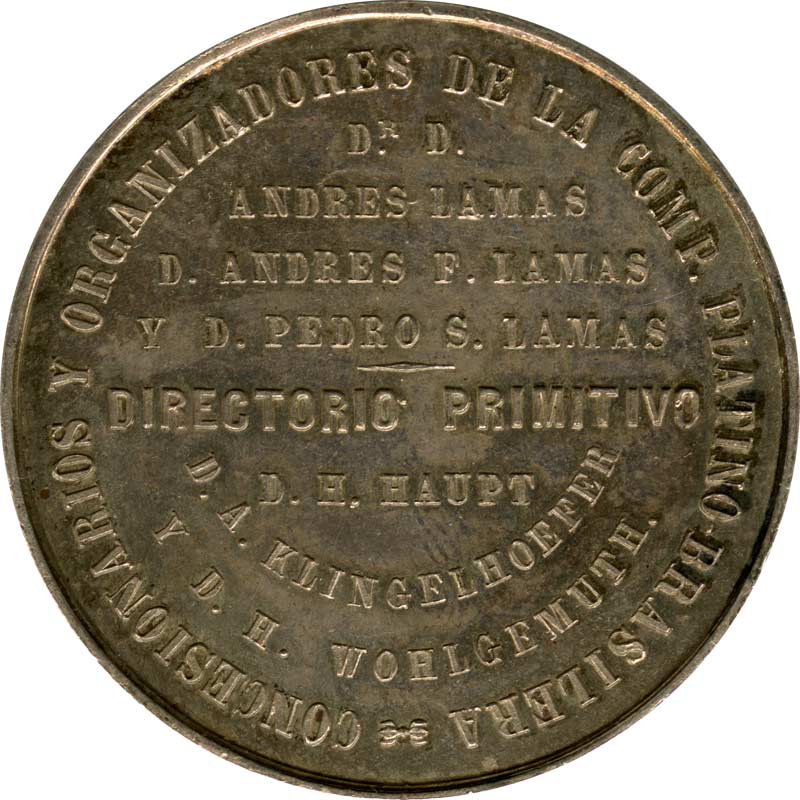Reverso: Concesionarios y Organizadores de la Comp. Platino Brasilera (Concessionaries and Organizers of the Platino-Brazilian Company) Dr. D. Andres Lamas D. Andres F. Lamas y D. Pedro S. Lamas Directorio Primitivo D. H. Haupt D. A. Klingelhoffer y D. H. Wohlgemuth. (texto y fotos ©http://atlantic-cable.com, traducido por Horacio Nigro). Ver más en el sitio web original.