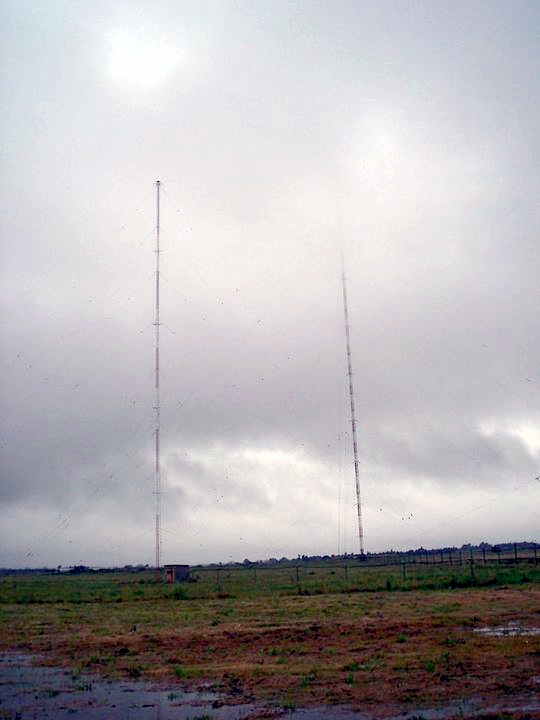Vista de las antenas en un día de tormenta: a la izquierda el mástil que soporta un extremo del dipolo horizontal para CXA4 (6125 kHz.), al centro el monopolo plegado de 80 metros de CX38 (1290 kHz.) y a la derecha el mástil irradiante de 245 metros de CX6 (650 kHz)