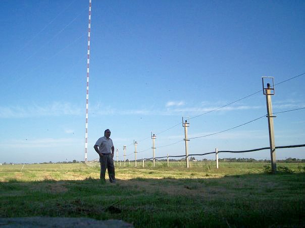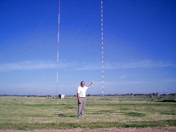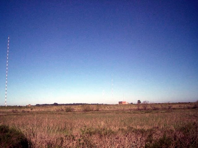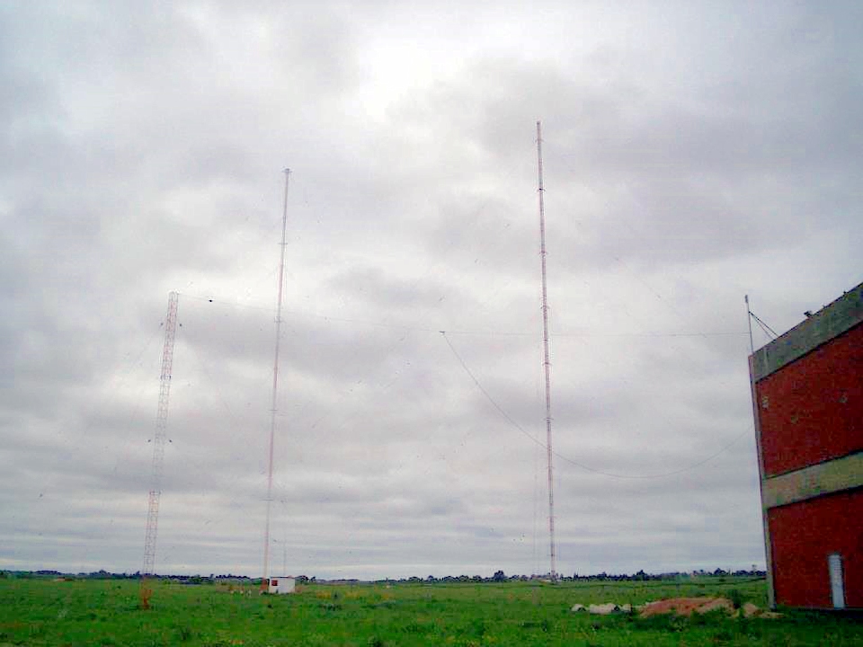 Otra vista de las antenas: a la izq. el monopolo plegado de 80 metros de altura de CX38 (1290 kHz), al centro el mástil irradiante de 245 metros de CX6 (650 kHz.), a la derecha la torre de 15 metros que tensa un extremo del dipolo horizontal de CXA4 (6125 kHz.), el otro extremo va a la estructura que se ve sobre el edificio.