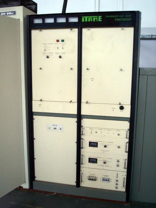Trasmisor de repuesto de CX-26 Radio Uruguay (1050 kHz). Marca ITAME modelo TAM-10.000 de 10 kW, salida y modulador valvulares, sistema de modulación por ancho de pulsos. Al costado derecho se ve en parte la fuente de alimentación de 13.000 voltios.