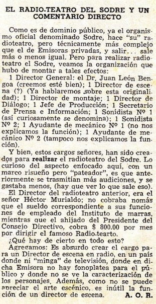 Curiosa nota, con firma sobre el funcionamiento administrativo del radioteatro del SODRE… (de Revista «Cancionera», marzo 25 de 1953, Nº 944)