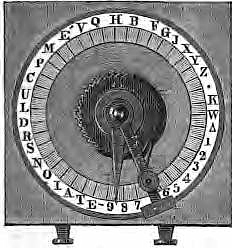 Manipulador rotativo de Jacob Brett, 185.Utilizaba una manivela rotativa en lugar del tradicional teclado. Con alfabeto romano, las letras y números eran despachadas más rápidamente. Utilizado por la Submarine Telegraph Company brevemente en 1851. Había también una versión portátil. (foto © Copyright – Steven Roberts 2011, http://distantwriting.co.uk)