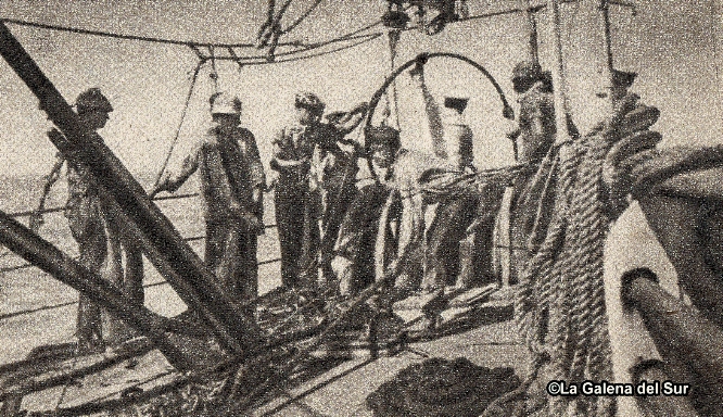 Los cables submarinos suelen averiarse y no es tarea fácil la localización de sus fallas. Vemos en esta nota gráfica un cable que ha sido pescado con los grampines y subido a cubierta para su reparación.